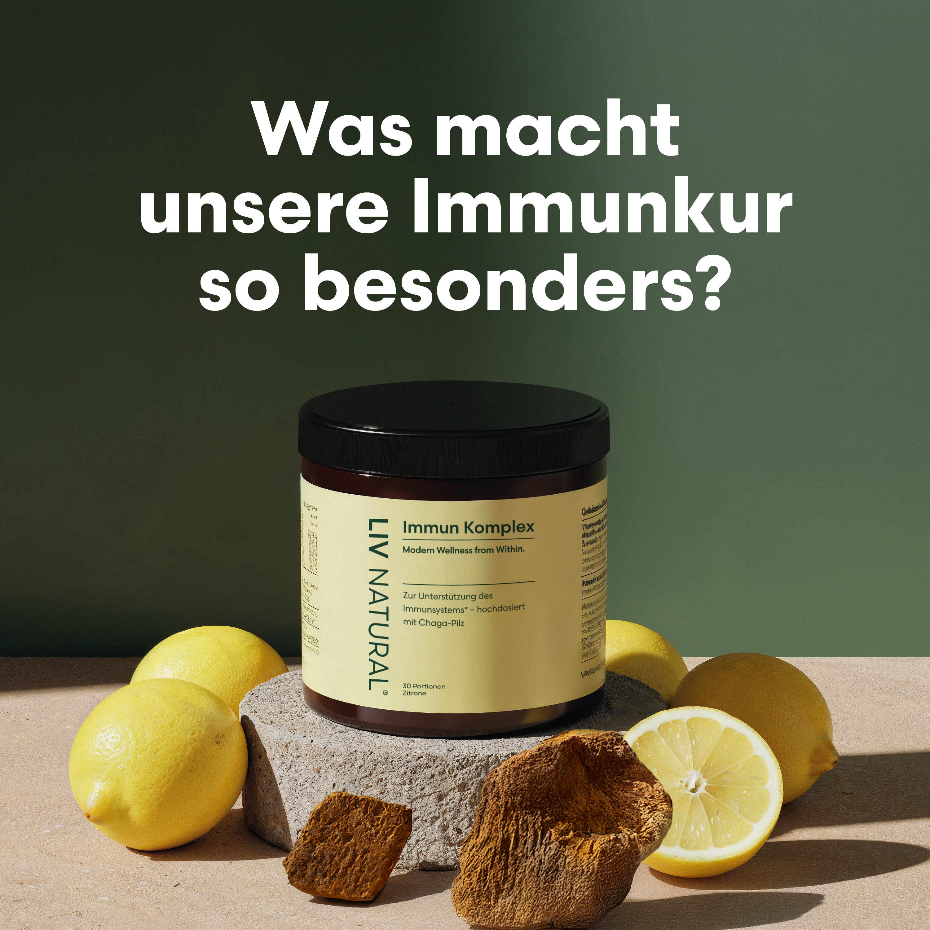 Die LIV Immunkur setzt auf eine durchdachte Kombination aus Vitaminen, Spurenelementen und funktionellen Pflanzenstoffen – allen voran den Chaga-Pilz, der traditionell in der nordischen Naturheilkunde als „König der Heilpilze“ gilt. Chaga enthält von Natur aus wertvolle Polysaccharide sowie antioxidative Verbindungen, die für ihre entzündungshemmende und zellschützende Wirkung bekannt sind. Gemeinsam mit Vitamin C, Zink, Selen und B-Vitaminen entsteht eine synergetische Formel, die deine Abwehrkräfte unterstützt, besonders in stressreichen oder herausfordernden Zeiten.