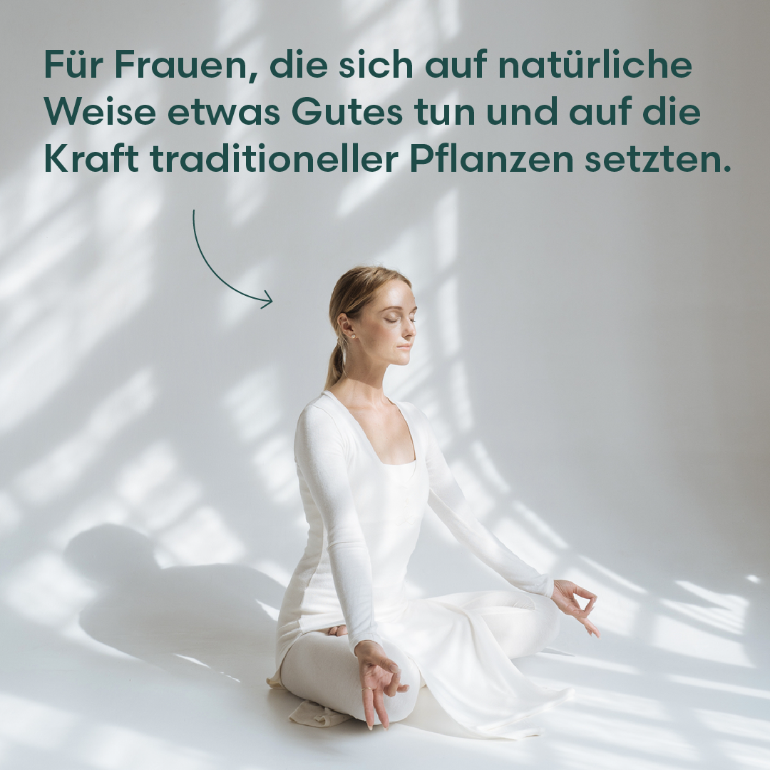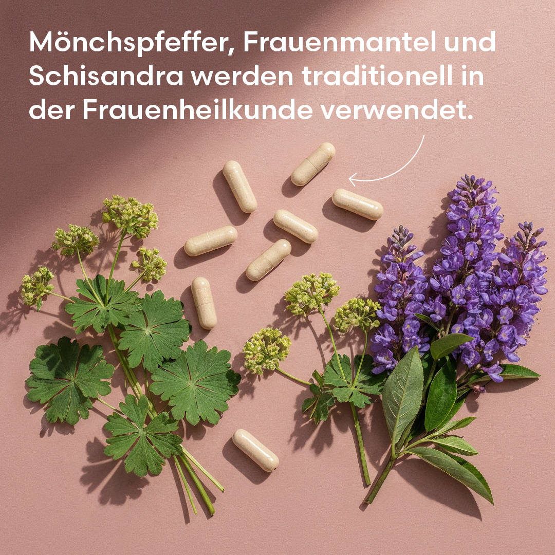 Die Formel vereint traditionell verwendete Pflanzenstoffe wie Mönchspfeffer, Brokkoli, Safran, Frauenmantel und Schisandra mit Vitamin B6, Vitamin B2, Vitamin B12, Folat (Quatrefolic®) und Zink – laborgeprüft und hergestellt in Deutschland.