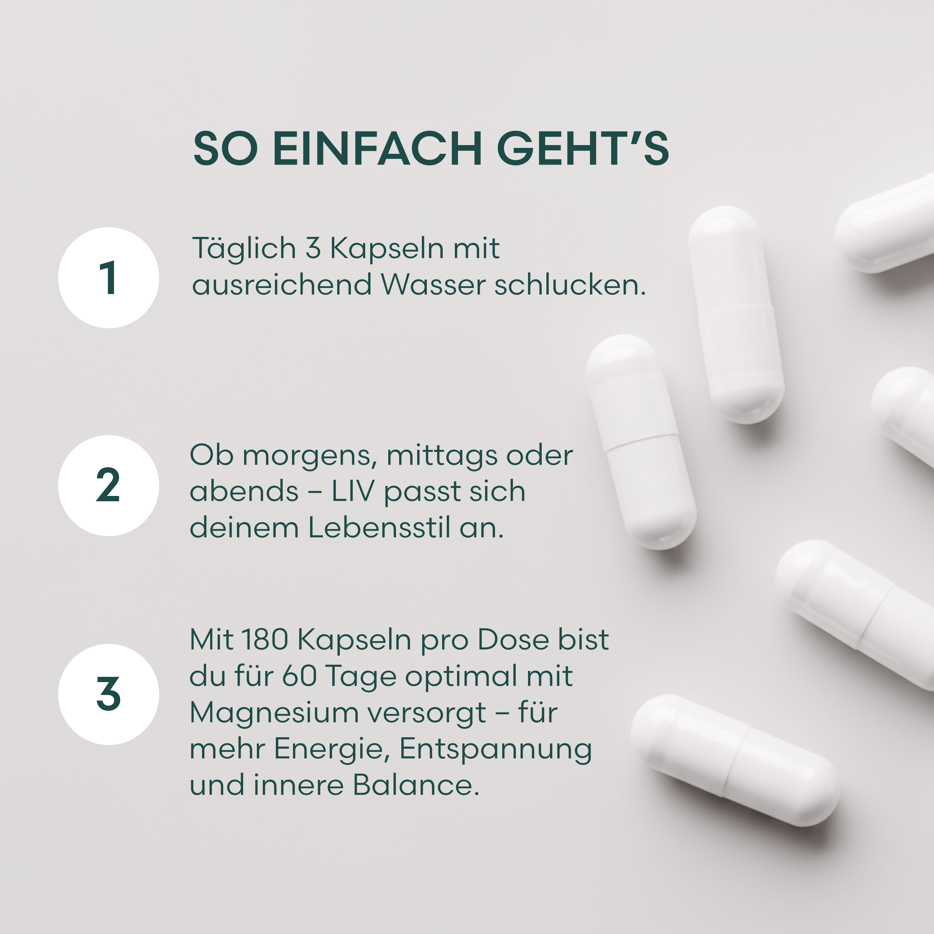 Nimm täglich drei Kapseln des LIV Magnesium Komplex mit ausreichend Wasser ein – ganz nach deinem Lebensstil, morgens, mittags oder abends. Jede Dose enthält 180 Kapseln, was für 60 Tage reicht. So bist du langfristig mit dem wichtigen Mineralstoff versorgt, den dein Körper für Entspannung, Energie und Gesundheit benötigt.