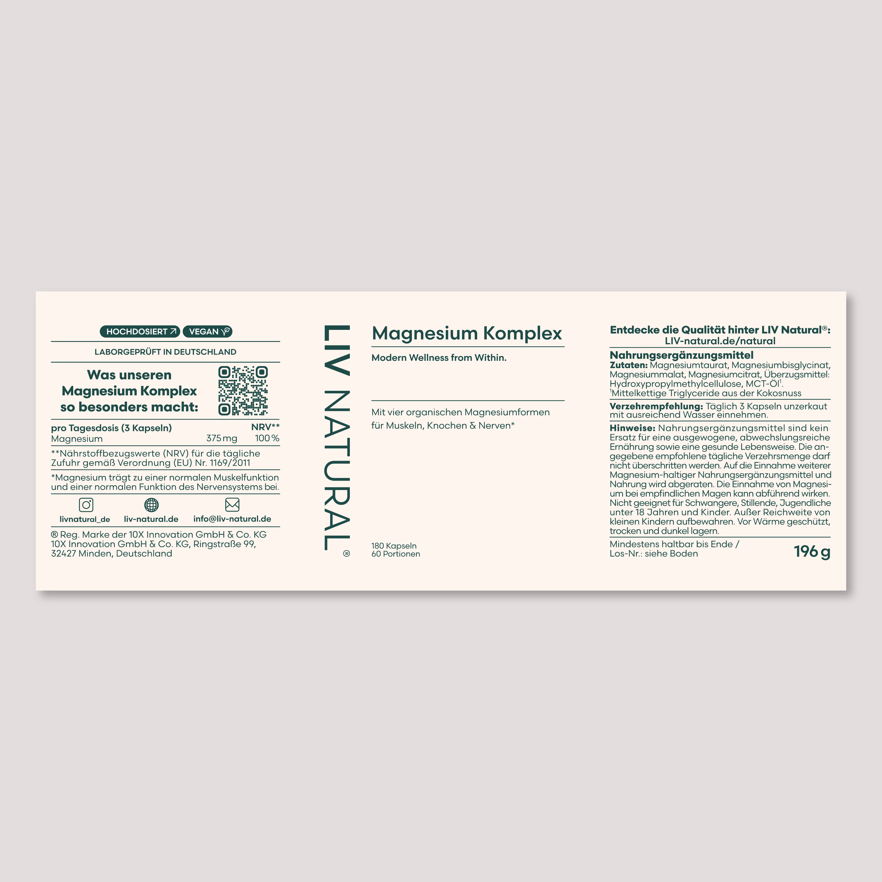 Magnesium ist essenziell – und mit dem LIV Magnesium Komplex erhältst du es in der besten Form. Unsere sorgfältig ausgewählte Mischung aus Magnesiumcitrat, -glycinat, -malat und -taurat deckt alle Bereiche ab, die für dein Wohlbefinden entscheidend sind: Stressreduktion, verbesserter Schlaf, Muskelentspannung und eine gesunde Herz-Kreislauf-Funktion. Dieser Komplex ist hoch bioverfügbar, was bedeutet, dass dein Körper das Magnesium besonders gut aufnehmen und verwerten kann. Und das Beste: Wir verzichten komplett auf unnötige Füllstoffe und Gentechnik.