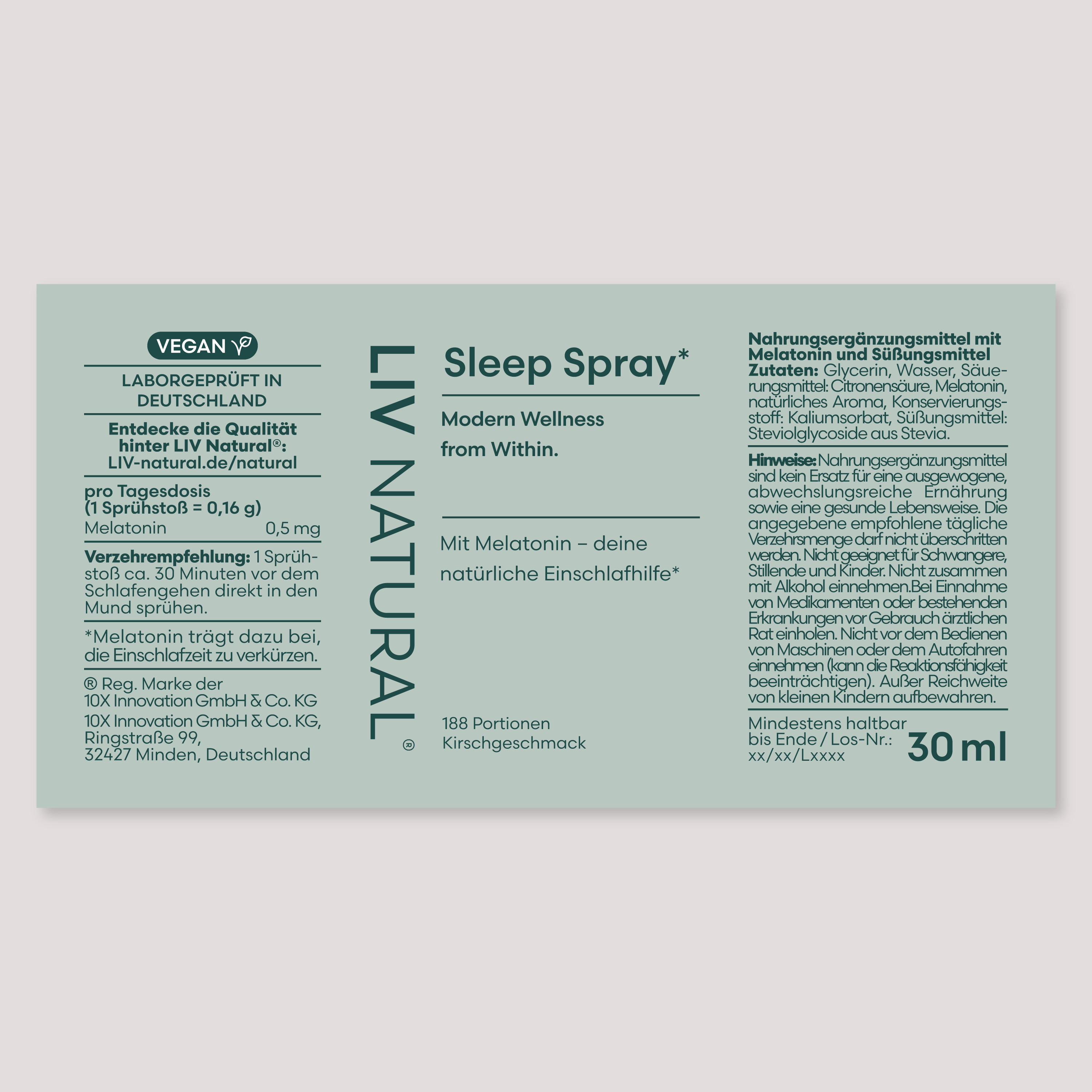 Unser LIV Sleep Spray Kirsche kombiniert effektives Melatonin mit natürlichem Geschmack für dein sanftes Einschlafritual. Die Aufnahme erfolgt direkt über die Mundschleimhaut – so entfaltet sich die Wirkung meist innerhalb von 15–30 Minuten.