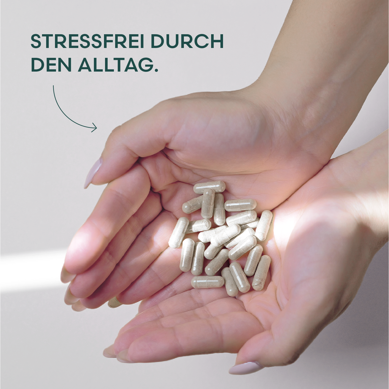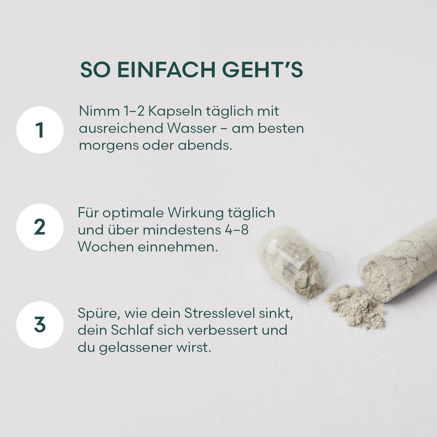 Täglich 1-2 Kapseln mit ausreichend Wasser einnehmen – ideal morgens oder abends, um deinen Körper bei Stressbewältigung und Entspannung zu unterstützen. Eine Dose enthält 120 Kapseln und reicht somit für mindestens 2 Monate.