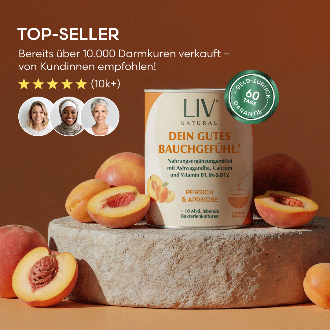Unser LIV Darm Komplex kombiniert 20 verschiedene Bakterienstämme mit Ashwagandha KSM-66®, Calcium sowie den Vitaminen B1, B6 und B12. Calcium trägt zu einer normalen Funktion von Verdauungsenzymen bei. Die Vitamine B6 und B12 unterstützen eine normale Funktion des Immunsystems und des Nervensystems.