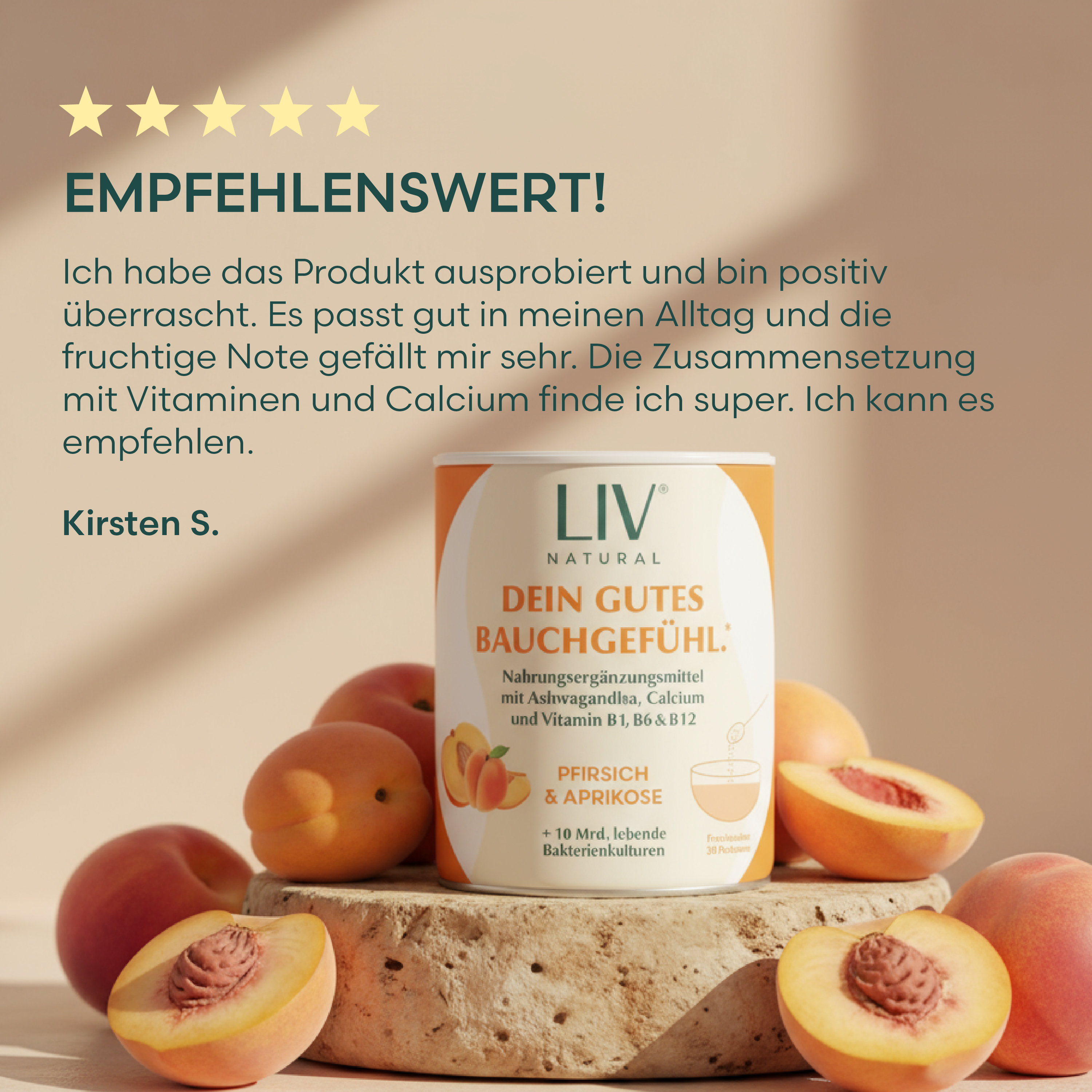 Bye Bye BlähbauchEnthält 10 Mrd. darmfreundliche Bakterien pro Portion. So viele wie noch nie und das merkt man, so kann deine Nahrung im Darm optimal zersetzt werden. Anders als vergleichbare Produkte auf dem Markt haben wir in unserem Wirkkomplex Ashwagandha enthalten. Der Markenrohstoff Ashwagandha KSM-66® hilft, stressige Situationen besser zu bewältigen und das allgemeine Wohlbefinden zu verbessern.Schmeckt einfach lecker: frisch & fruchtig nach Pfirsich, aus ganzen Früchten.Vielseitige Anwendung: Egal, ob in Wasser, Joghurt oder Smoothies. Der Start in den Tag gelingt damit stressfrei und entspannt.