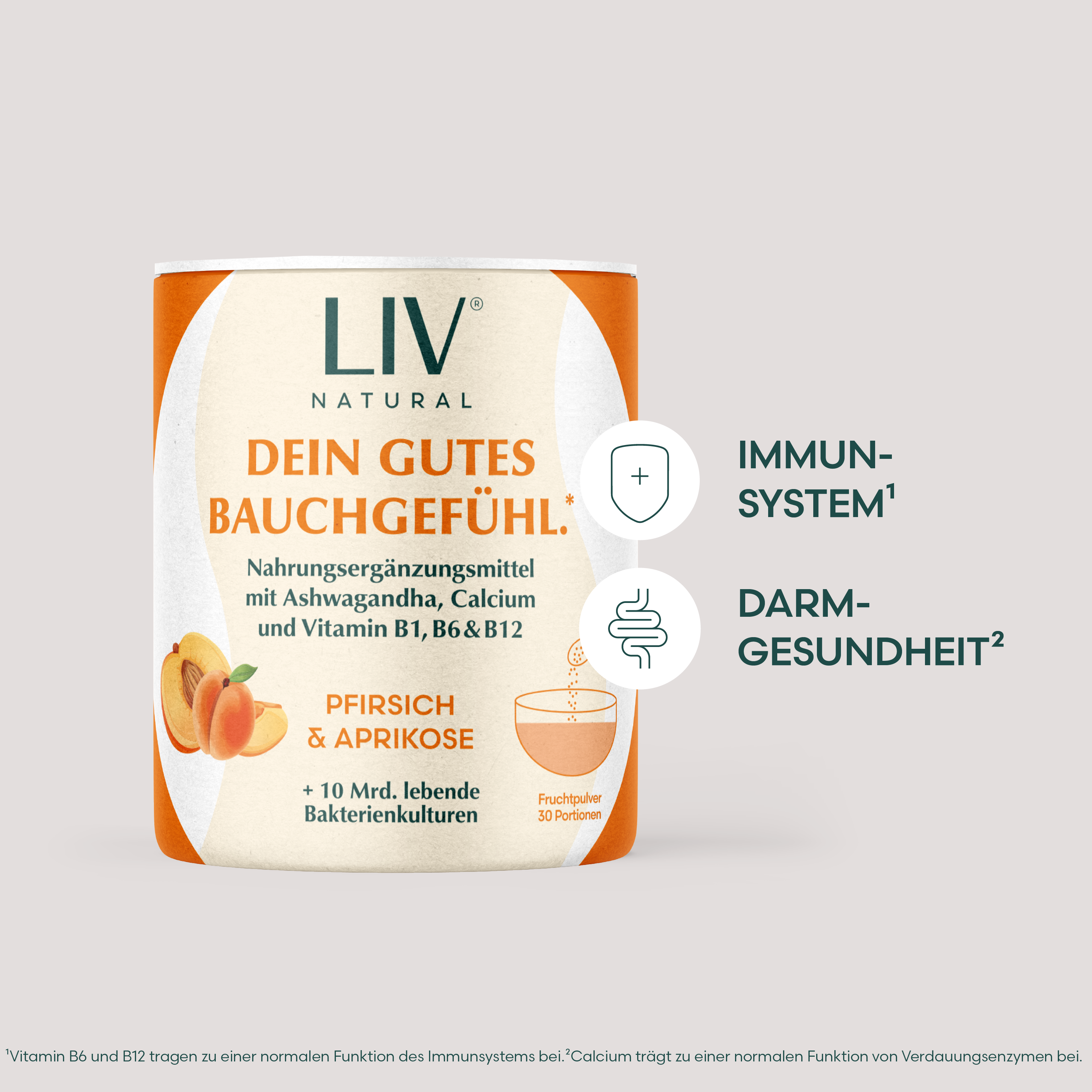 39 % Aprikosenfruchtsaftpulver, 22 % Pfirsichfruchtsaftpulver, Calciumcitrat, 7,5 % Ashwagandhaextrakt¹ (enthält 5 % Withanolide), natürliches Pfirsicharoma, natürliches Aprikosenaroma, 2,5 % Bakterienmischung (Bifidobacterium breve BBR60, Bifidobacterium longum BL21, Bifidobacterium bifidum BBI32, Bifidobacterium infantis BI45, Bifidobacterium animalis BA12, Bifidobacterium lactis BLA80, Lactobacillus gasseri LG08, Lactobacillus plantarum LP90, Lactobacillus bulgaricus LB42, Lactobacillus reuteri LR08, Lactobacillus helveticus LH76, Lactobacillus fermentum LF61, Lactobacillus salivarius LS97, Lactobacillus brevis LB01, Lactococcus lactis LLA61, Lactobacillus rhamnosus LRA05, Lactobacillus paracasei LC86, Lactobacillus acidophilus LA85, Lactobacillus crispatus LCR86, Lactobacillus casei LC89) , Akazienfaser, Süßungsmittel: Steviolglycoside aus Stevia; Vitamin B6, Vitamin B1 (Thiamin), Vitamin B12.