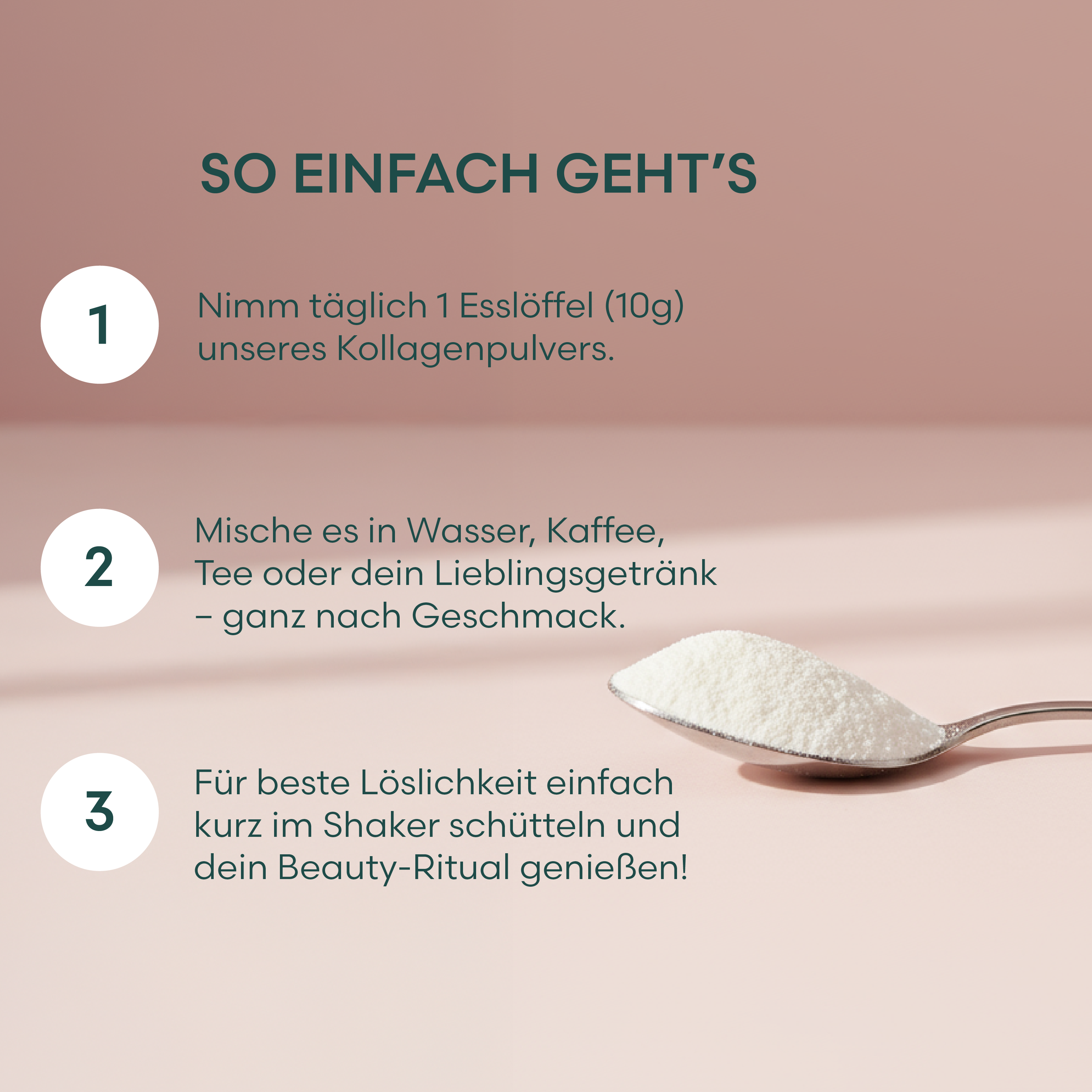 Für optimale Ergebnisse empfehlen wir, täglich 1 Esslöffel (10 g) unseres Kollagenpulvers in Wasser, Kaffee, Tee oder dein Lieblingsgetränk einzurühren. Für eine noch bessere Auflösung verwende am besten einen Shaker.