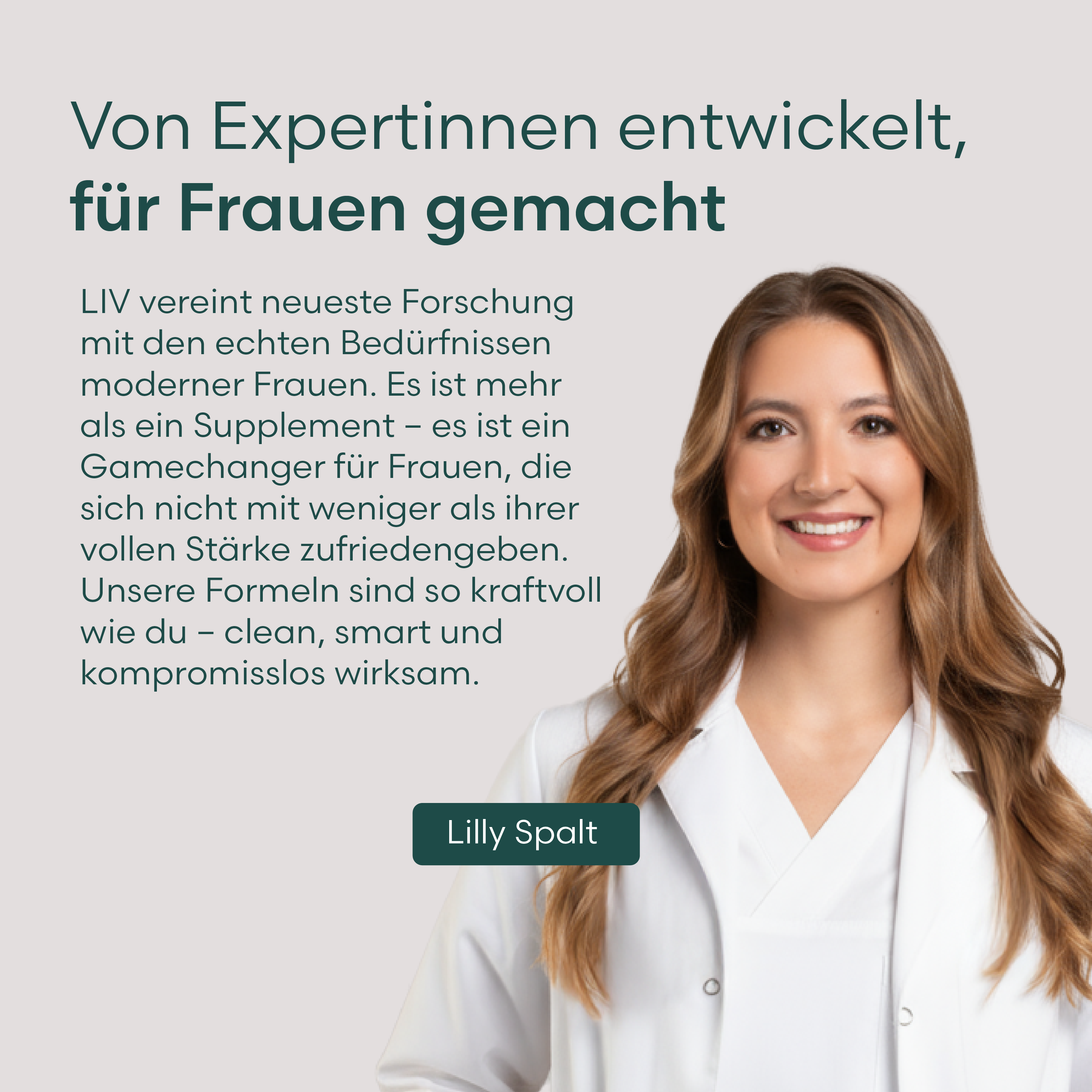Bei LIV verbinde ich Erkenntnisse aus Prävention, Longevity-Forschung und Ernährungswissenschaft, um Produkte zu entwickeln, die Frauen nicht nur im Moment unterstützen, sondern ihre Gesundheit und Lebensqualität nachhaltig fördern.